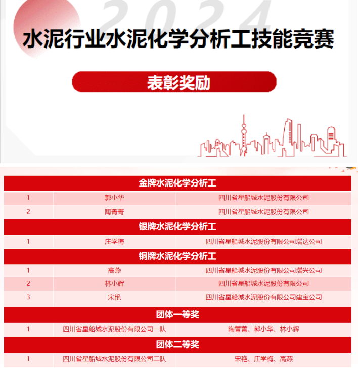 9月24日,由中國(guó)水泥協(xié)會(huì)發(fā)布關(guān)于《2024年水泥行業(yè)水泥化學(xué)分析工技能競(jìng)賽》表彰獎(jiǎng)勵(lì)的決定,對(duì)8月22日至26日,在四川綿陽(yáng)舉行的2024年全國(guó)水泥化學(xué)分析工技能競(jìng)賽中涌現(xiàn)出來(lái)的優(yōu)秀選手和單位進(jìn)行表彰。其中,星船城公司共6名參賽選手在總共60名參加決賽的選手中脫穎而出,郭小華以總成績(jī)第1名、陶菁菁以第3名的成績(jī),榮獲“金牌水泥化學(xué)分析工”稱號(hào);莊學(xué)梅榮獲“銀牌水泥化學(xué)分析工”稱號(hào);高燕、林小輝、宋艷榮獲“銅牌水泥化學(xué)分析工”稱號(hào)。星船城公司一隊(duì)(陶菁菁、郭小華、林小輝)以總成績(jī)第一名榮獲團(tuán)體一等獎(jiǎng);星船城公司二隊(duì)(宋艷、莊學(xué)梅、高燕)以總成績(jī)第八名榮獲團(tuán)體二等獎(jiǎng);實(shí)現(xiàn)全部參賽選手進(jìn)入決賽、全部獲得個(gè)人競(jìng)賽獎(jiǎng)及團(tuán)體一、二等獎(jiǎng)的歷史最佳戰(zhàn)績(jī)。